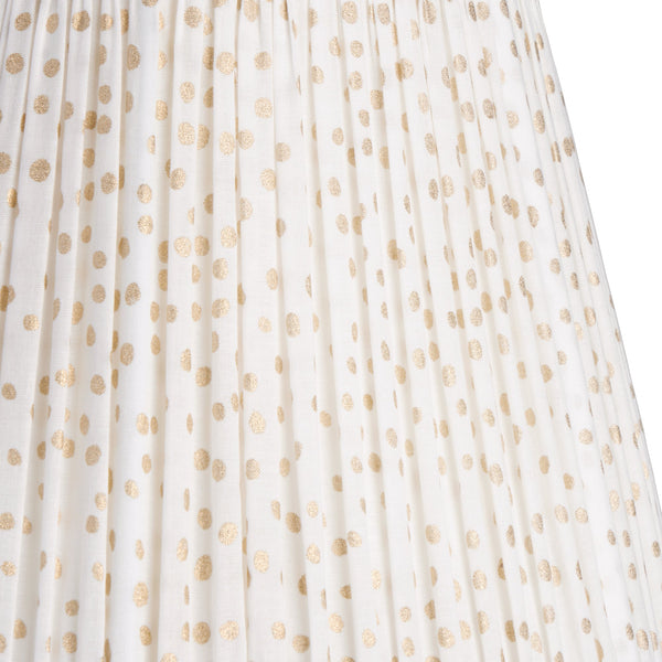 A soft cotton shade block-printed by hand by incredibly skilled craftspeople in a workshop near Jaipur and then pleated and lined. Little spots of gold colour.