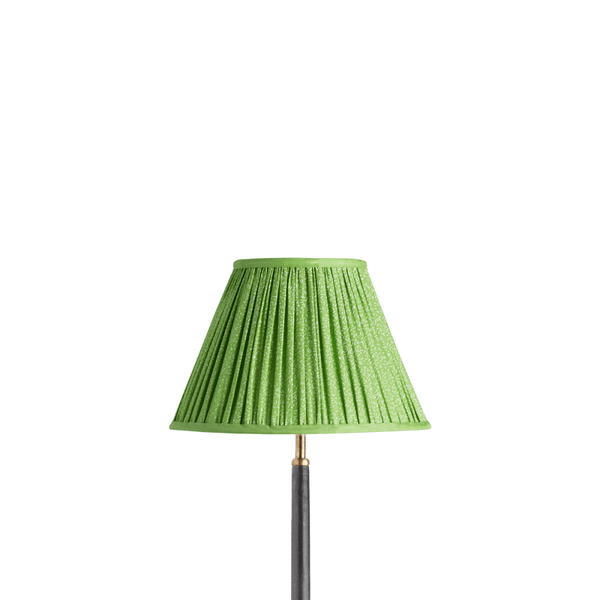 A soft cotton shade block-printed by hand by incredibly skilled craftspeople in a workshop near Jaipur and then pleated and lined – a meadow green base cloth with lots of little white dash doodles.