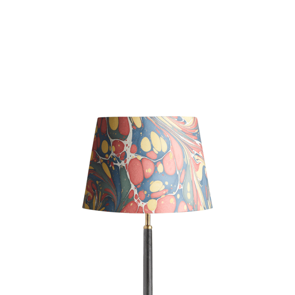 The marbling of paper is a craft that dates back hundreds of years, and it is fascinating to watch. Paints and oils are carefully dropped onto a thickened water, and are then raked and stretched to create the pattern. The paper is then slowly laid on top and once imprinted removed from the liquid and dried. No two pieces of paper can ever be the same. We are thrilled with these patterns - bold and brilliant. Please note that due to the smaller surface area required to create this effect, this shade will have two seams.