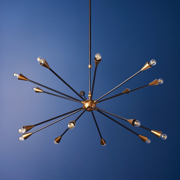 The first satellite was launched into space in 1957 - and the world's gaze was focussed skywards. Our Ariel chandelier is a nod to the Sputnik lights that became so popular in the mid century. Beautifully made and joyously dramatic, with this larger of the two sizes there are fourteen "shooting stars" to hold your attention...Comes with a certain level of self-assembly required.