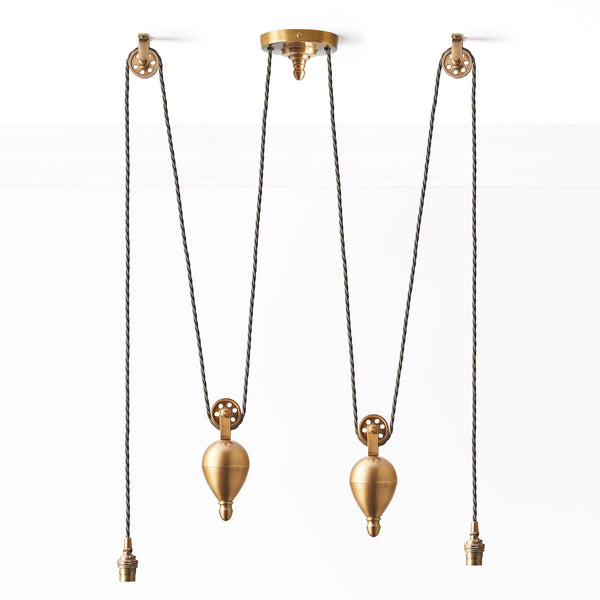In perfect equilibrium. Weight the brass eggs (they unscrew) to create the ideal balance for the shades you choose. Then you are able to play to your heart's delight with the array of brass wheels and flex to find the ideal height for your light. A little bit Caractacus Potts, but brilliantly efficient.