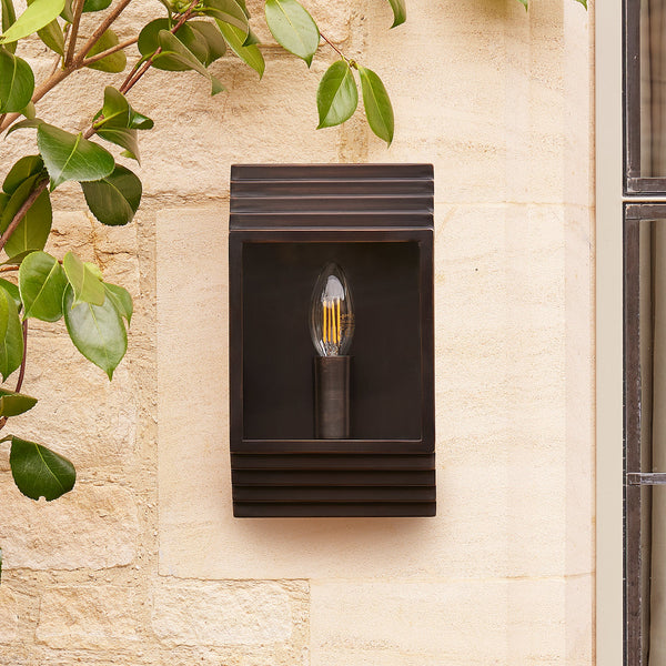 Art Deco meets modern groove. Our Hayle wall lantern is an arresting and glorious new design, a little different from you standard outdoor wall light....but, hey....if you want to stand out. Seen here is Bronze.