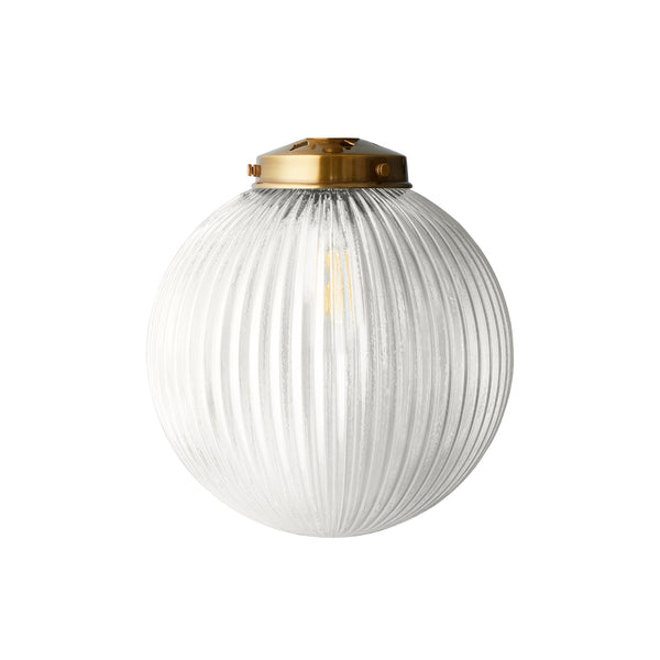 Simple really - a prismatic glass dome. The lovely, ribbed prismatic blown glass casts off a subtle dappled light across the room. A gallery is required to allow this espere to hang from pendant kits and wall fittings.