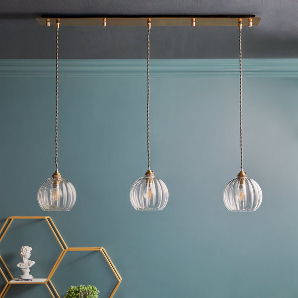 Our Plateau pendant set hangs three shades, of whatever style, at whatever height you wish. One beautifully polished and finished plank of brass sits on the ceiling, appearing to float, since the bracket is inset. It is understated, but undeniably stylish, and hugely adaptable.