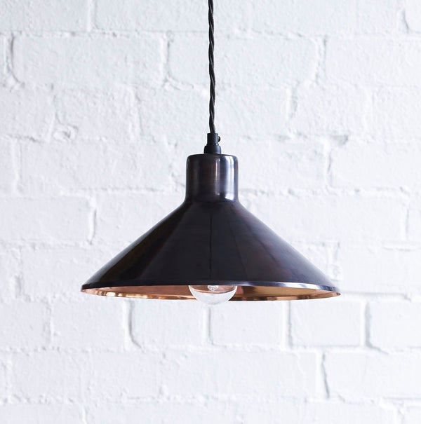 We modelled this on a pendant we saw in shop in Copenhagen. It has all the Scandi cool you could wish for, whilst being sleek and classic. Made form solid brass, this has a rich bronze finish on the exterior and a warm copper glow from inside.